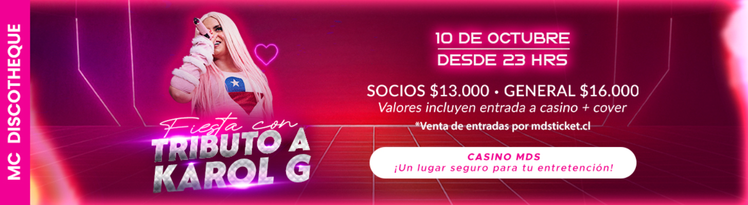 Este viernes 10 de octubre desde las 23:00 hrs, MC Discotheque en Casino MDS presenta una fiesta imperdible con tributo a Karol G. Disfruta sus grandes éxitos en una noche llena de ritmo, energía y diversión.